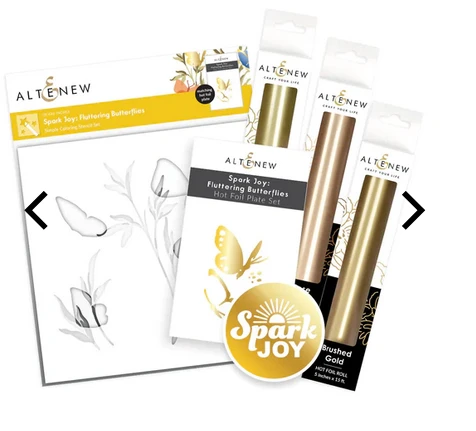 Verleihen Sie der Heißfolie Flatternde Schmetterlinge Magie mit dem passenden einfachen Malschablonen-Set. Schablone Nr. 1 erzeugt zwei geschichtete Schmetterlinge, die mit der partiellen Schmetterlings-Heißfolienplatte abgestimmt sind, und Schablone Nr. 2 und Nr. 3 erzeugen geschichtete Blätter auf hohen Zweigen.