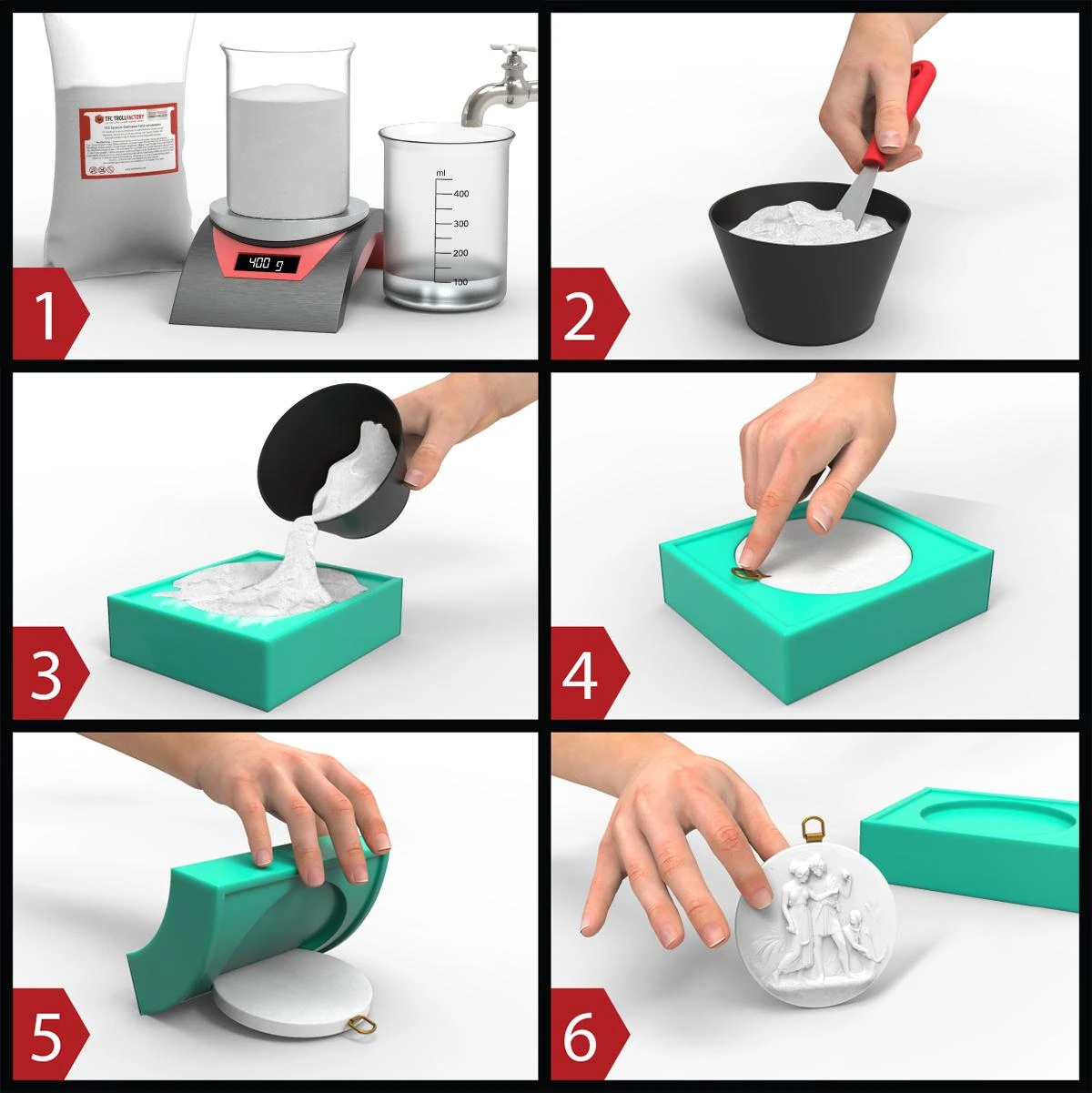 TFC Xyrarock ist eine synthetische, kunststoffveredelte Giessmasse auf Gipsbasis, die sich sehr gut für das Giessen von Figuren, Modell- oder Geländebauteilen sowie für Reliefs und Kunstgegenstände eignet.
